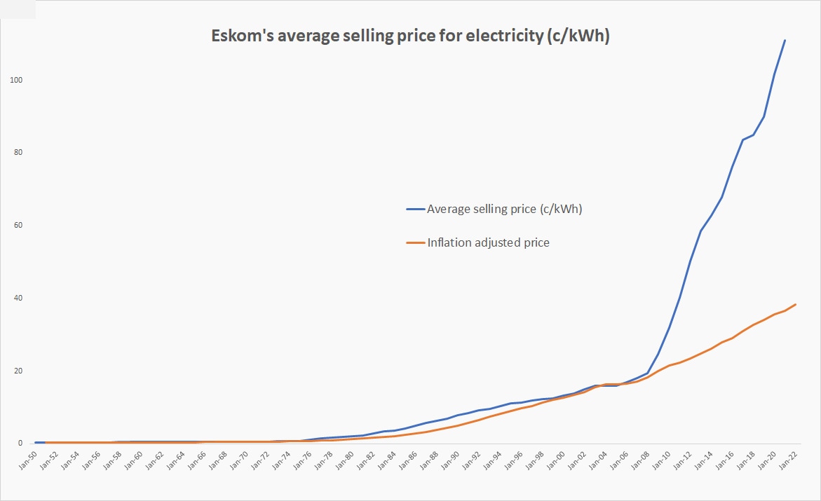 A Daily Investor analysis of Eskom prices against inflation from 1950 shows that after 2008, South Africa’s electricity prices skyrocketed relative to inflation.