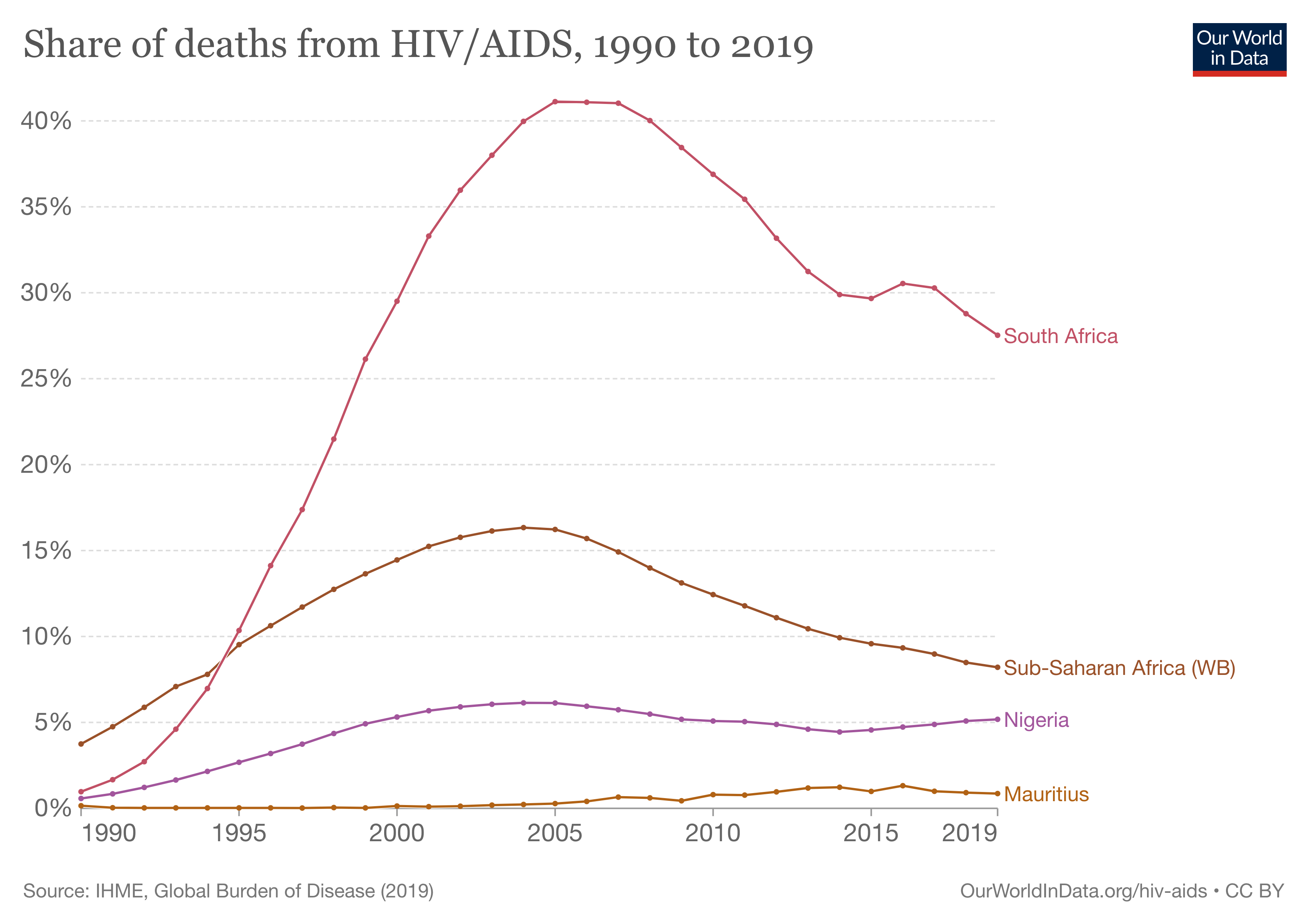The proportion of deaths due to HIV/AIDS in South Africa remains higher than the Sub-Saharan African average.