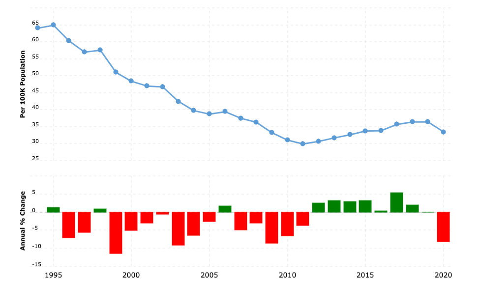 World Bank data shows that after a steady decline between 1994 and 2011, crime in South Africa began increasing again.
