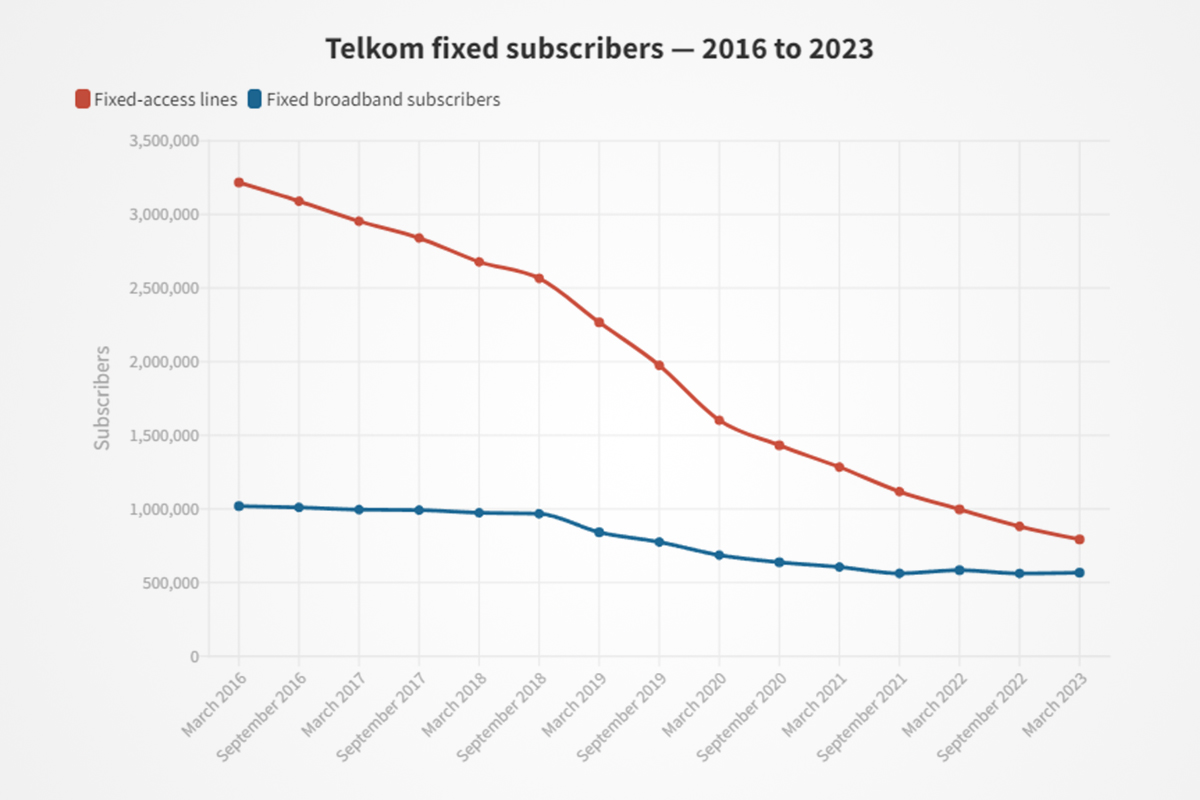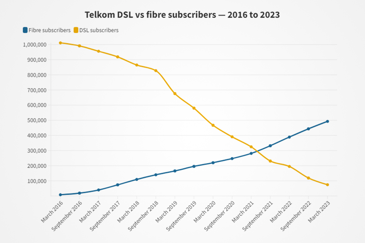 While Telkom does not publish precise numbers for its declining DSL customer base, a figure can be calculated by subtracting the number of homes connected to fibre from the total fixed broadband subscribers.