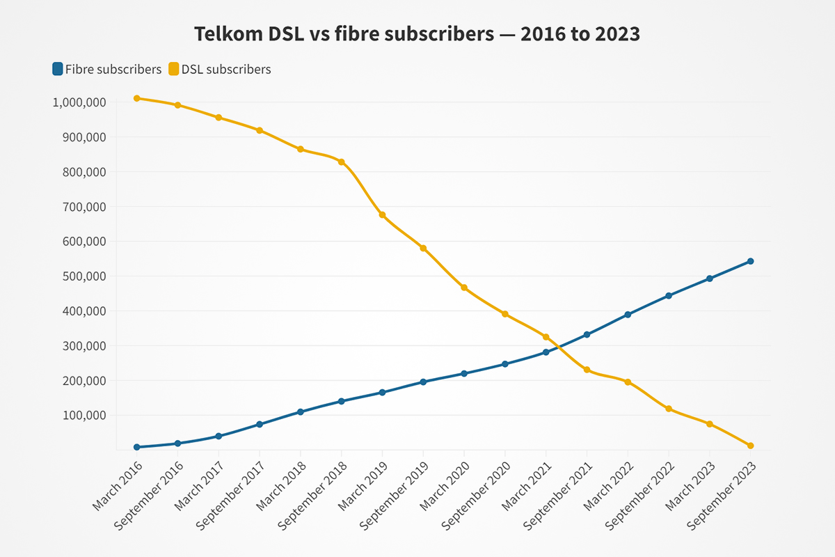 2016 had the highest number of DSL customers at any point in the technology’s history and was the first year Telkom started reporting home fibre subscribers.