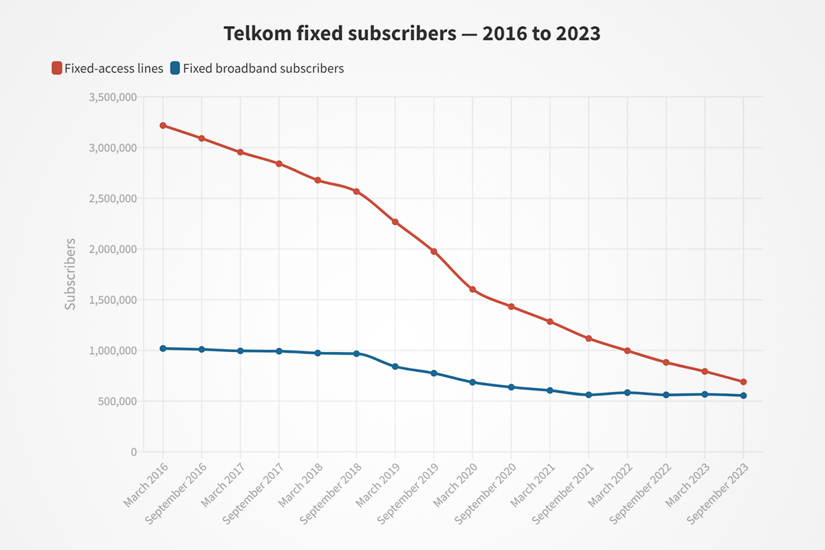 The results show that Telkom’s total fixed access lines — which includes those used only for voice services — have dropped from 882,000 in September 2022 to 690,000 in September 2023. That compares with a peak of 5.49 million at the end of March 2000.