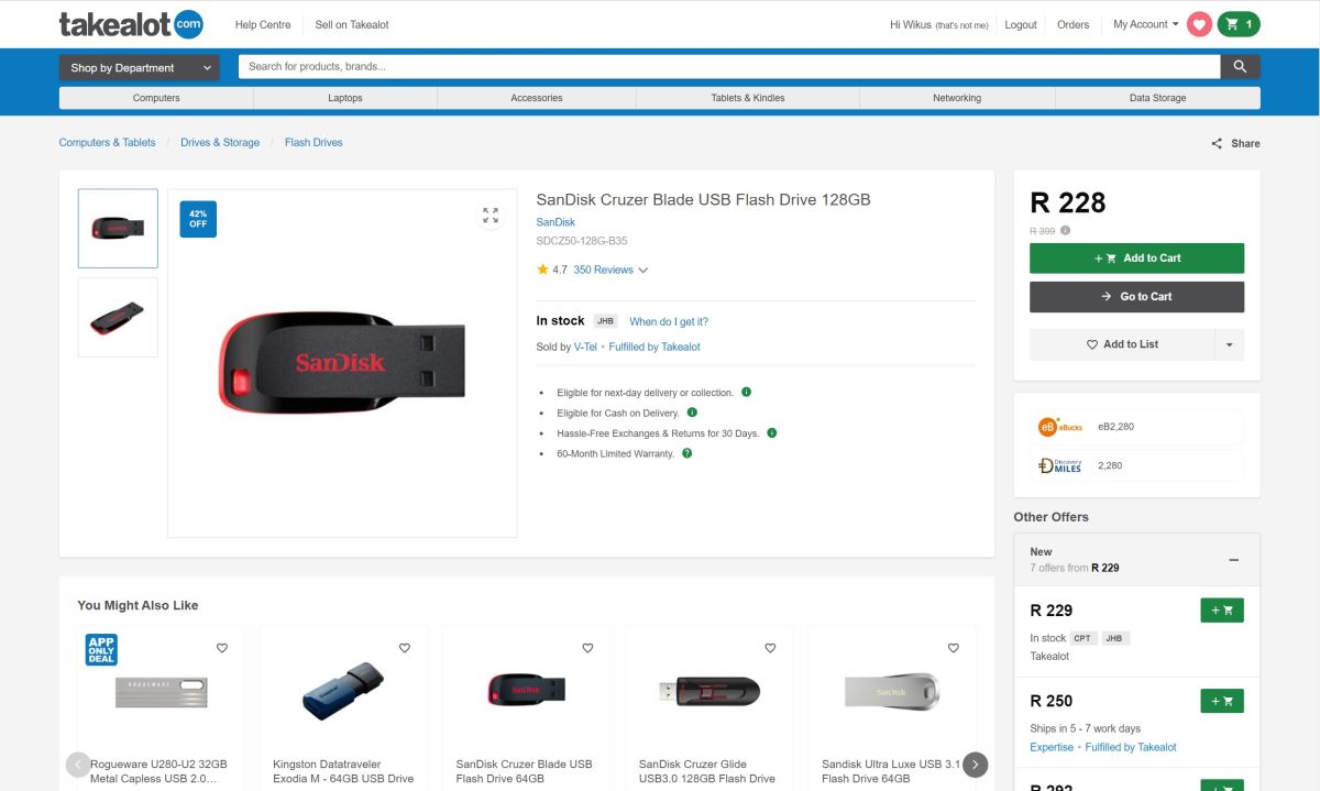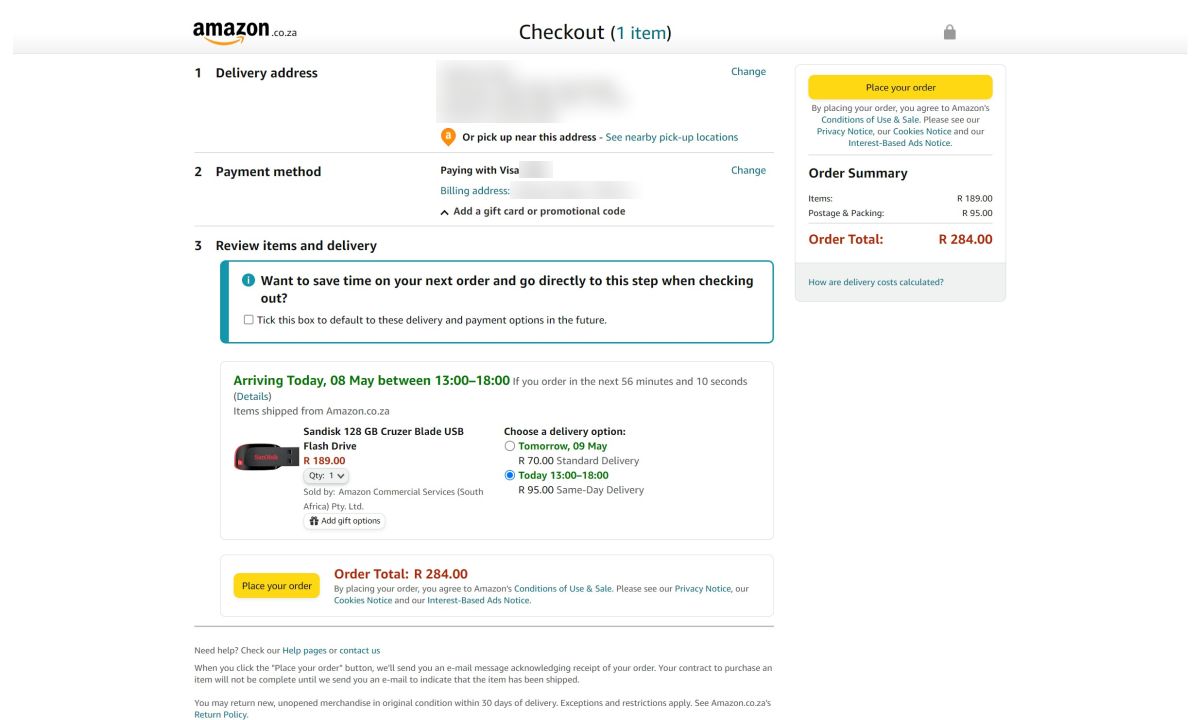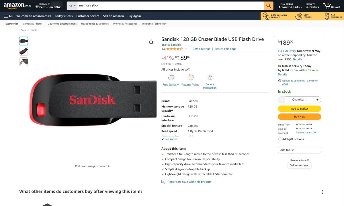 To see how Amazon South Africa compares to Takealot, we ordered identical SanDisk flash drives from both stores at 9 am Wednesday morning to test the same-day delivery claims.