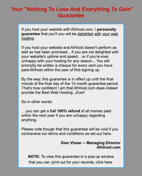 “By the way, this guarantee is in effect up until the final minute of the final day of the 12-month guarantee period. That’s how confident I am that Afrihost.com does indeed provide the Best Web Hosting… Ever!”