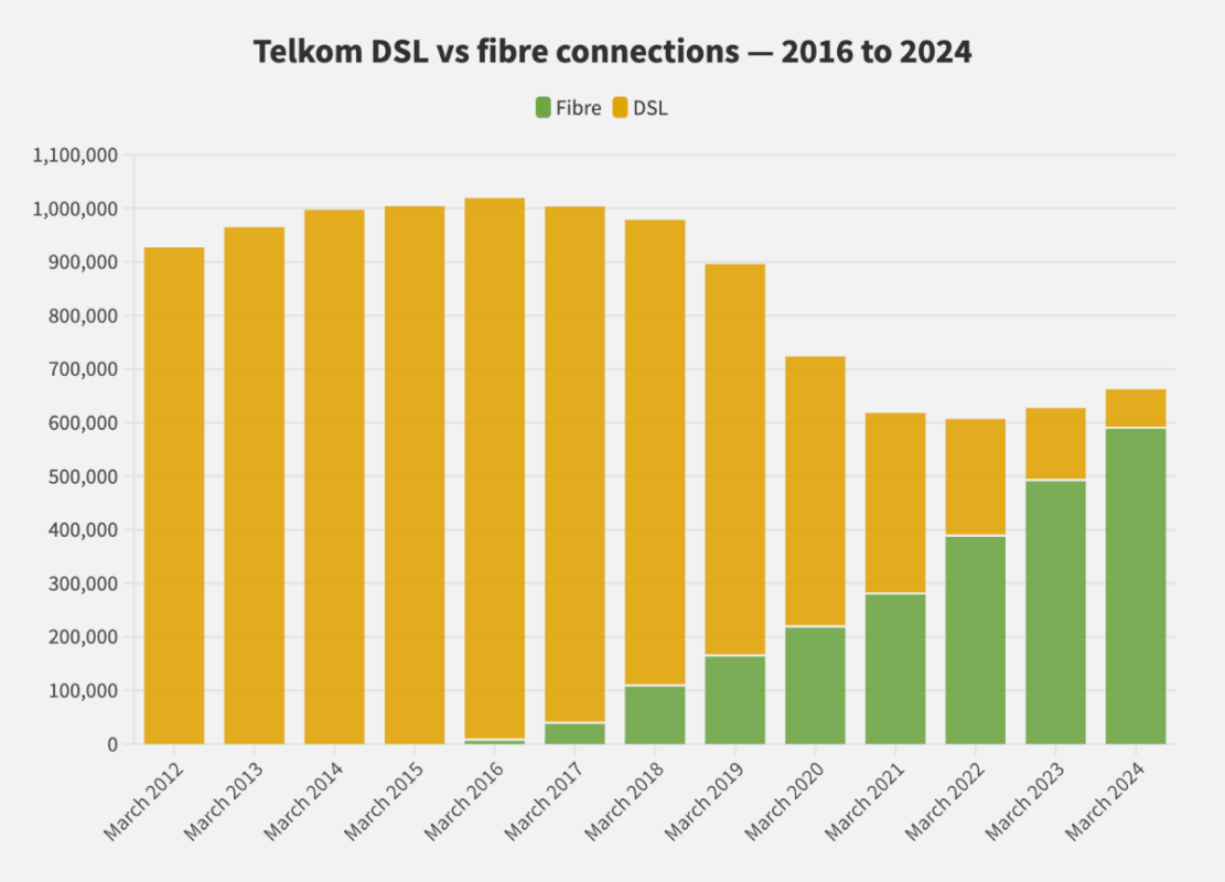 Over the next four years, Telkom’s DSL connections plummeted by more than 500,000 while it only increased fibre customers by roughly 220,000.