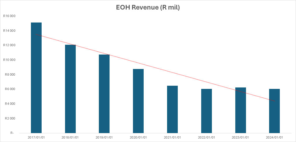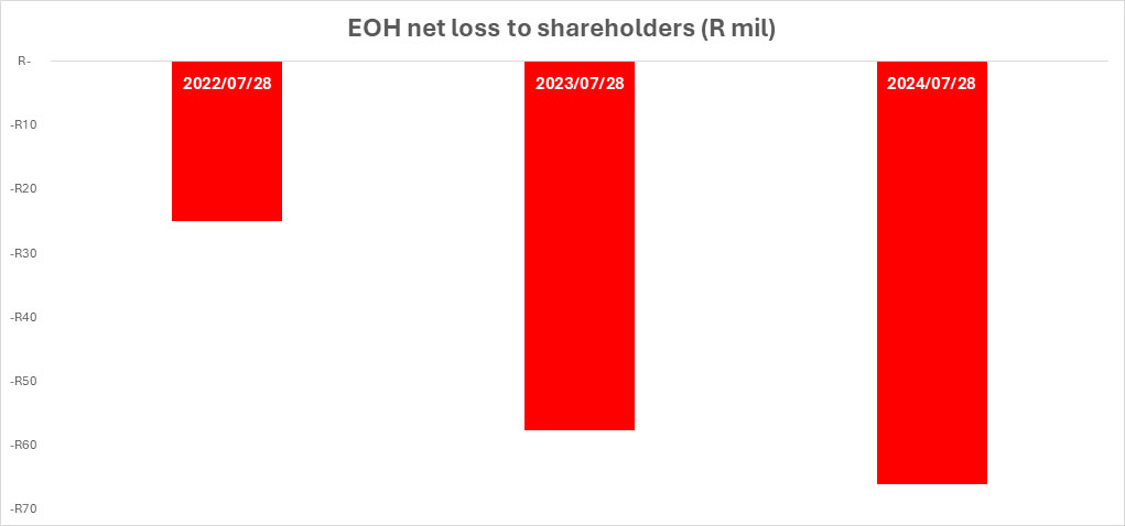 On top of this, EOH has reported a worsening net loss. The company reported a net loss of R66 million in 2024, 14% worse than last year.