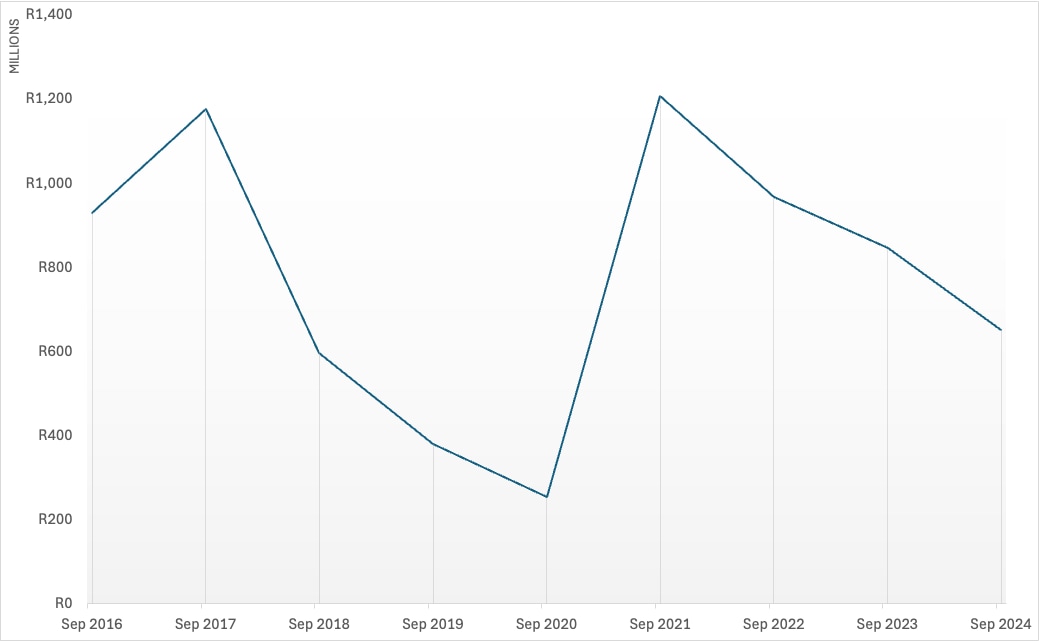 The chart below shows how Telkom’s fibre capex has fluctuated since 2016 and how it has declined since 2021, in particular.