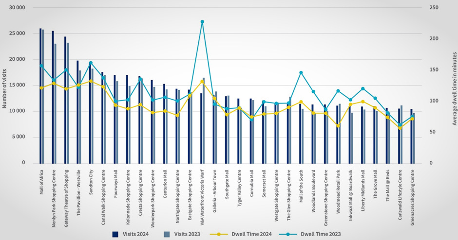 “Cape Town’s V&A Waterfront Victoria Wharf again topped the dwell time table in terms of minutes spent inside the mall, although 2024 was down to just over 130 minutes from nearly 230 minutes in 2023,” Lightstone added.