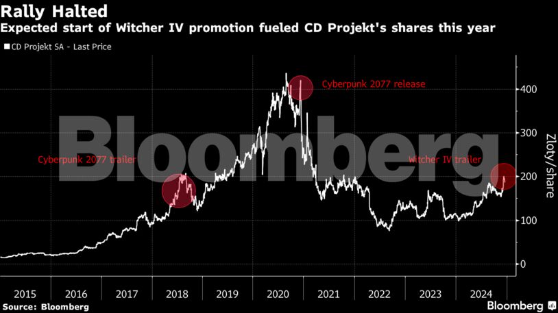 Shares in CD Projekt SA dropped in heavy trading as the release of a six-minute video trailer of the Polish gaming studio’s upcoming release of The Witcher IV didn’t include any timeline for its premiere.