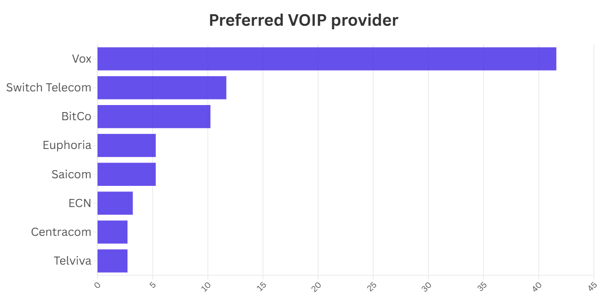 VOX dominates the VOIP space in South Africa, with 42% of the vote, while the closest competitors, Switch Telecom and Bitco received only 12%.