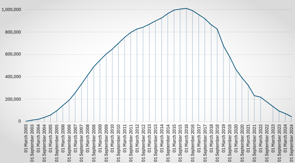 The chart below tracks Telkom ADSL subscriber numbers from 31 March 2003 to 30 September 2024, using Telkom’s half and full-year results.
