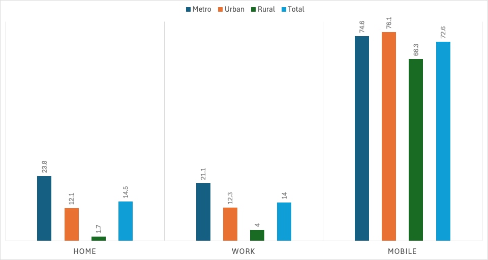 While 66.3% of households in rural areas had some kind of mobile data connection, this was also much lower than in metros (74.6%) and urban areas (76.1%).