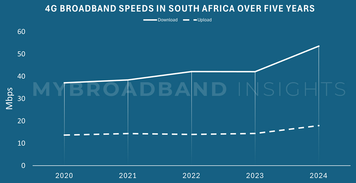 MyBroadband Insights used data collected from the MyBroadband Speed Test app, comprising over 6.1 million speed tests performed over 4G connections during the five-year period.
