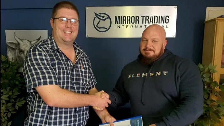 He is pictured above on the right, shaking hands with the late founder and CEO of MTI, Johann Steynberg, after signing a deal to buy 50% of the company the scam operated under.