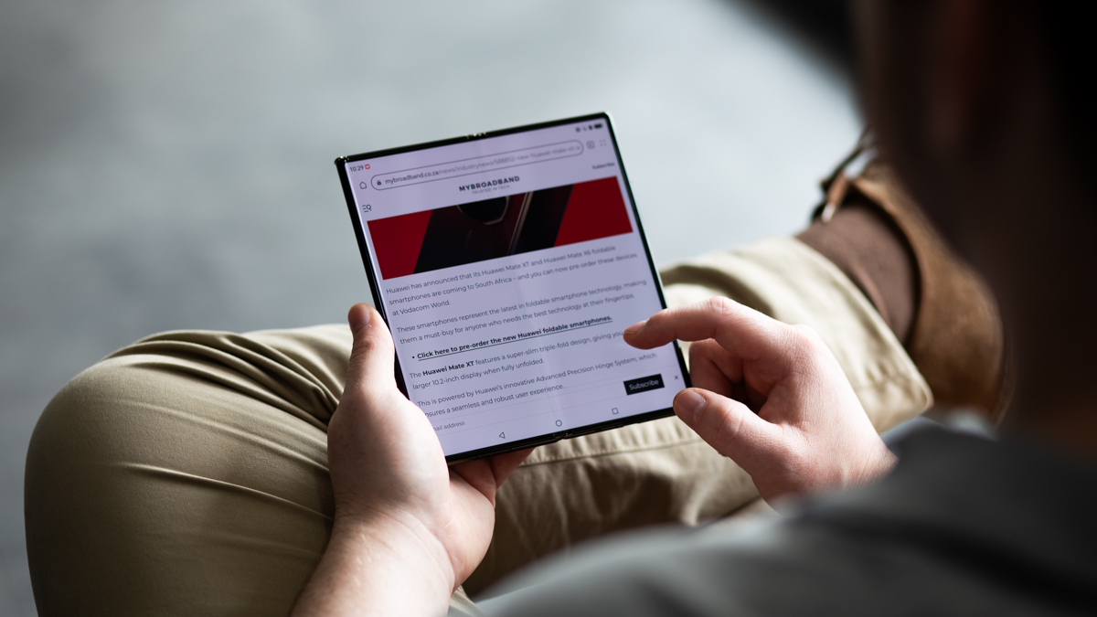 When folded, the Huawei Mate XT offers a familiar-sized 6.4-inch display that is compact and perfect for on-the-go one-handed use, such as texting.