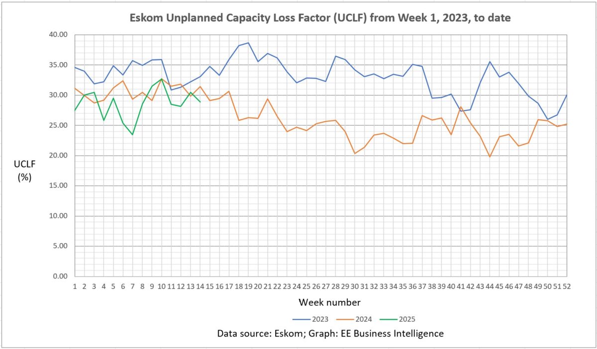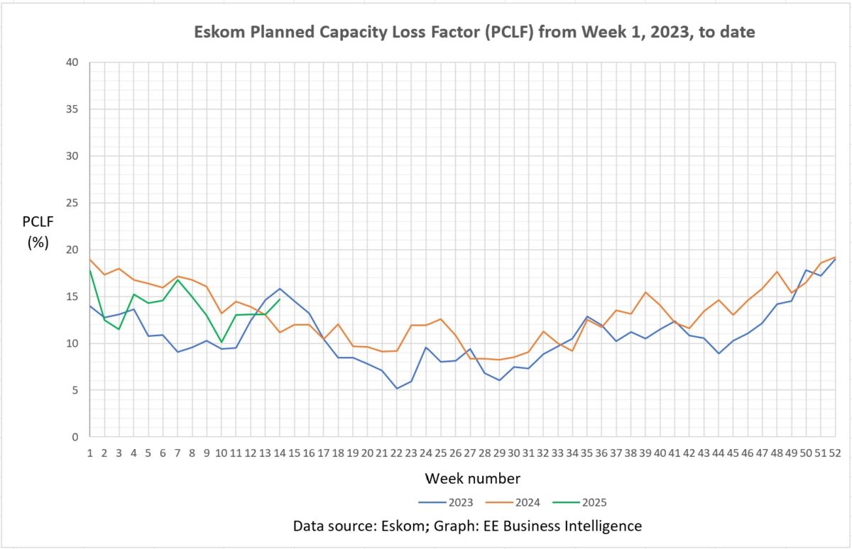 This performance data includes Eskom’s energy availability factor (EAF), planned maintenance outage (PCLF) and unplanned outage (UCLF).