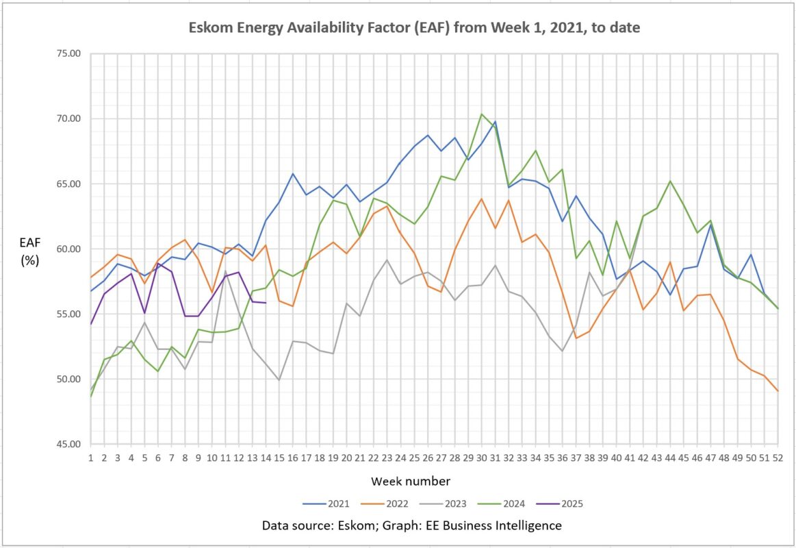 Since January 2025, Eskom’s EAF varies from 54.22% to 58.86%, with an average of 56.59%.