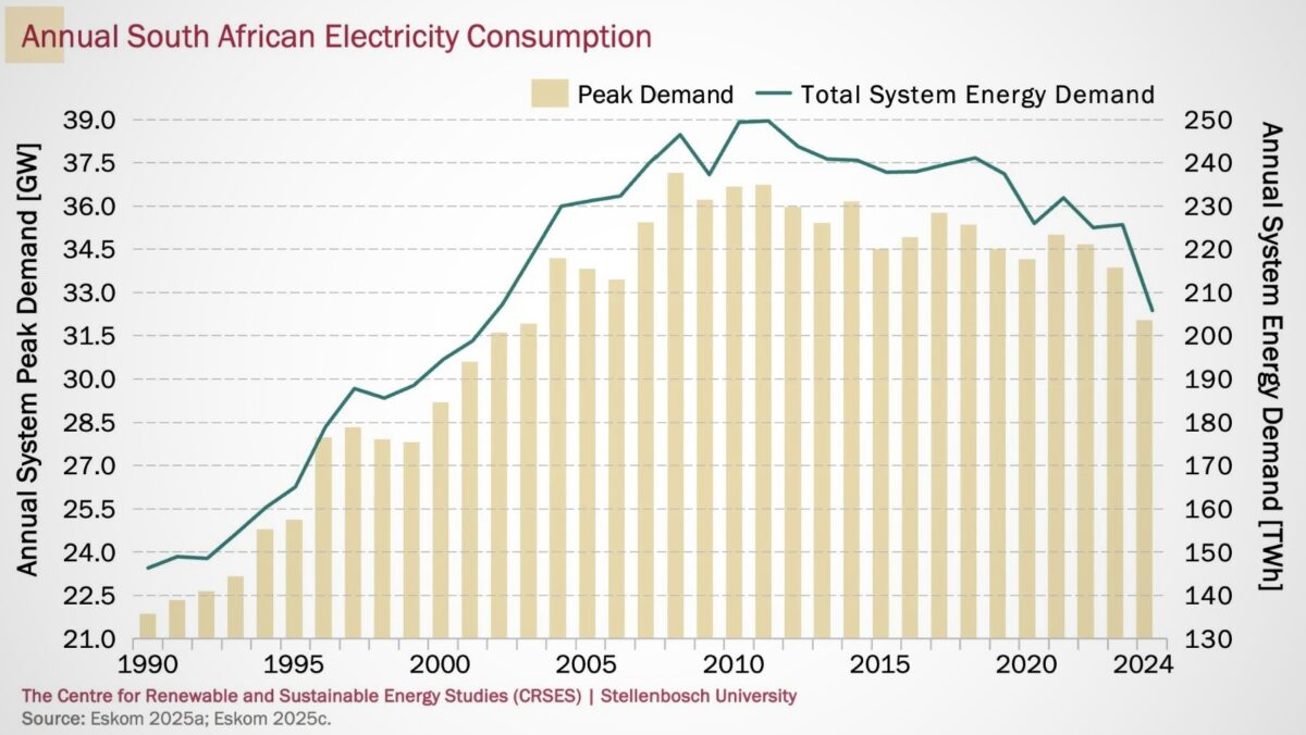 In the chart above, Stellenbosch University’s Centre for Renewable and Sustainable Energy Studies showed that peak and overall electricity demand dropped sharply in 2024.