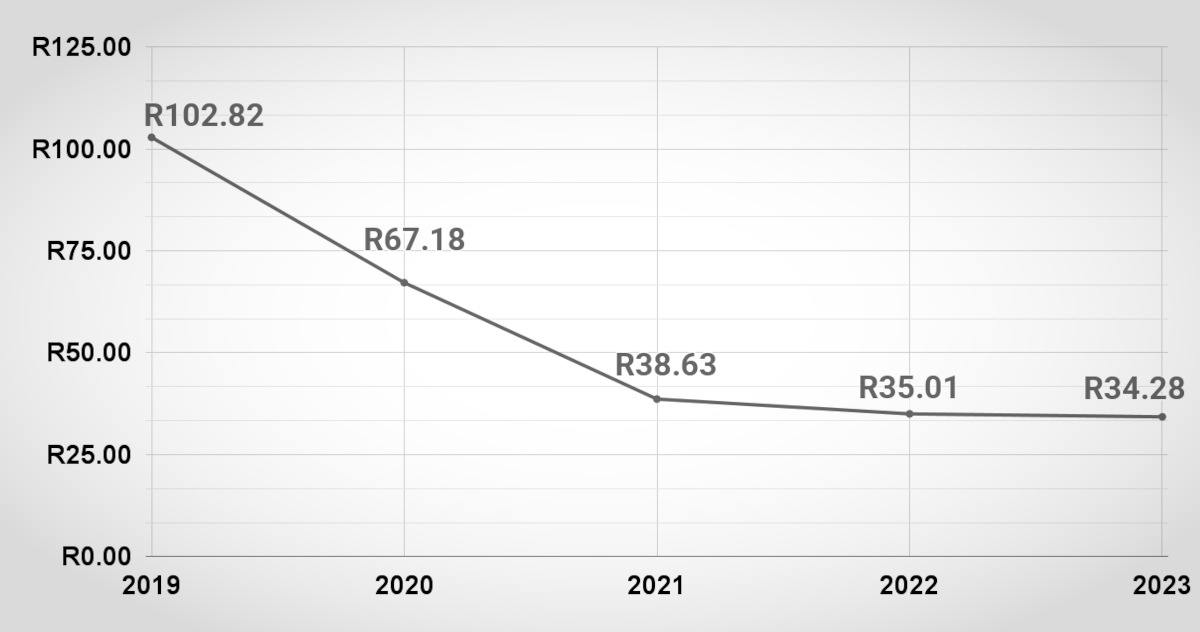 For reference, the dollar price dropped to $2.04 (then R35.01) in 2022 and $1.81 (then R34.28) in 2023.