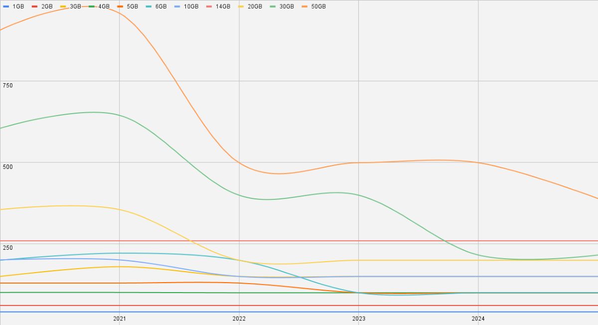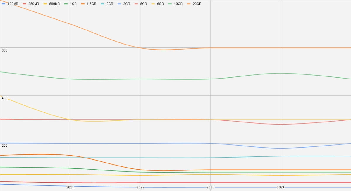 Most of the bundles, ranging from 100MB to 20,480MB, saw significant price decreases from 2020 to 2022.