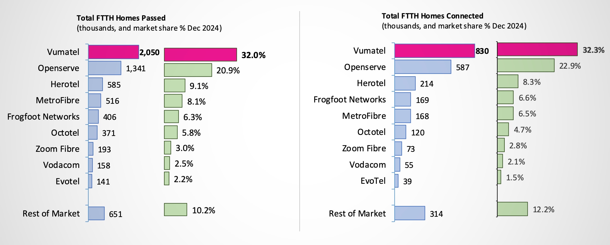 Citing Africa Analysis, Dube said Vumatel alone had 32% FTTH market share in terms of homes passed and homes connected as at December 2024.