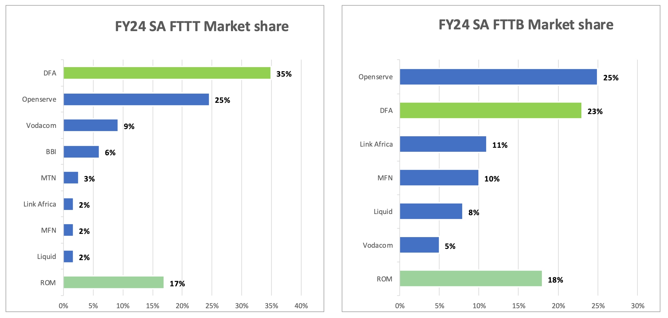 However, Openserve maintains its lead with 25% market share in fibre-to-the-business while DFA is hot on its heels with 23%.
